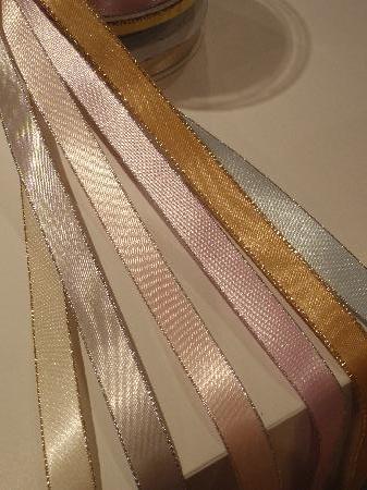 15mm double faced satin ribbon with metalic edge. Per Meter. Gold and Cream with gold edge, other colours with silver edge.