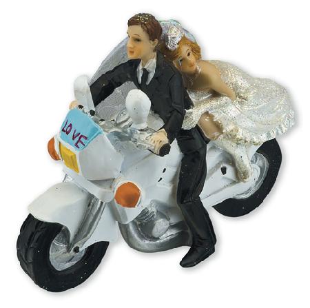 Pretty resin motor bike with bride and groom riders.