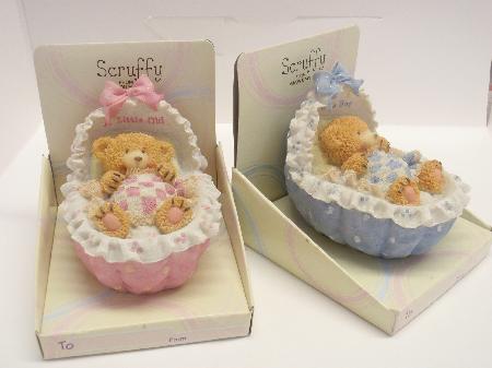 Scruffy Teddy in cot cake topper. With pretty patchwork quilt and bow details. Pink has "Its a Girl" wording on cot and blue has "Its a Boy" wording on cot. 8cm.