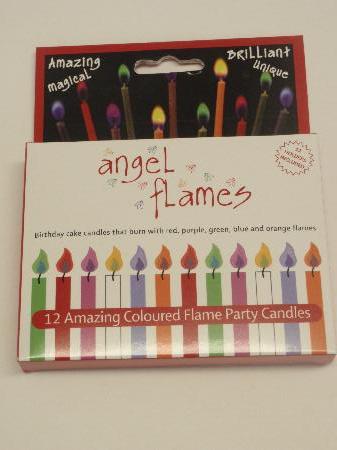 Pack of 12 candles which burn with multi coloured flames, plus holders.
